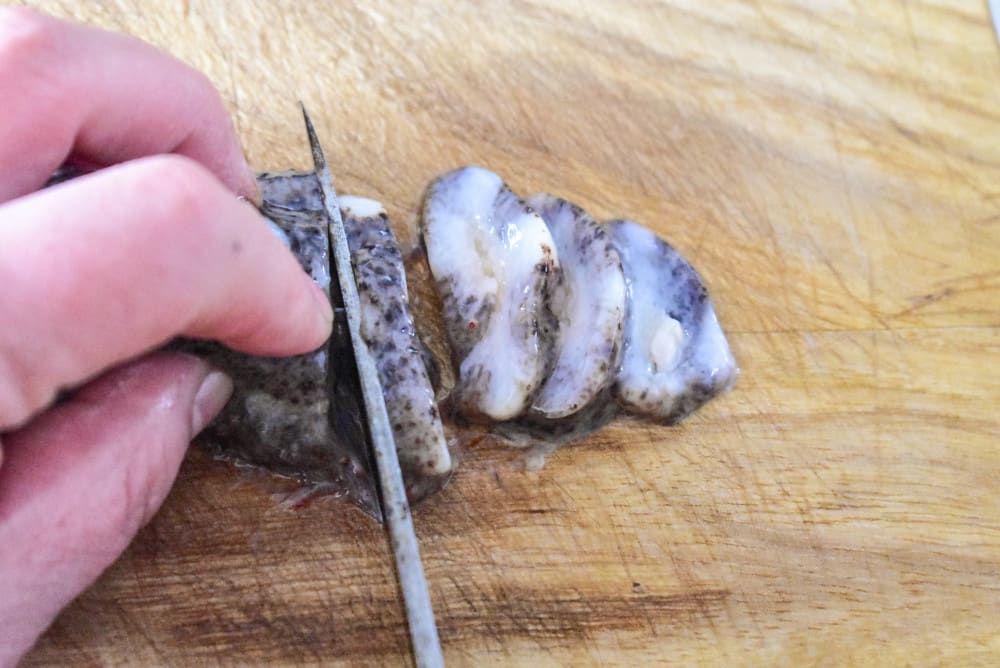 干し海鼠 真ナマコの内臓を抜き、海水か海水に近い薄い食塩水で煮たあと、水気を切って天日乾燥させたもの。 (マナマコに近いキンコも同じように煮干にされ、値が高い) 和食では主に煮物の材料にする。 中国では普通の料理に使われるだけでなく小さいナマコのさばき方 小型なまこは、開かずに切ったほうが良いです。 サイズが小さいナマコを開いて縦半分にすると、スライスして酢にした時にはあまりにも小さくなりすぎて、これはこれで食べにくいですから。 ① 上と同じくまず両端(肛門と口
